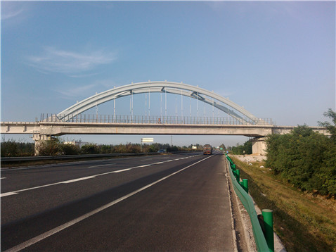 海青鐵路跨榮烏高速公路特大橋是海青鐵路全線特殊工跨(跨路施工)中,跨度最大,風險最高的一個,主跨(DK9+723.950~DK9+789.65)上部采用鋼管混凝土系桿拱結(jié)構(gòu),計算跨徑64m,梁長65.5m。