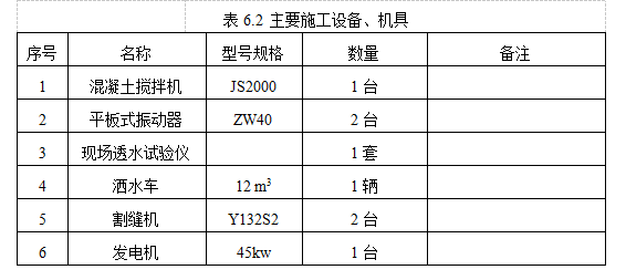 本工法涉及的主要機(jī)具包括:混凝土攪拌機(jī)、平板式振動(dòng)器、現(xiàn)場透水試驗(yàn)儀、割縫機(jī)、灑水車、發(fā)電機(jī)等(見表6.2),輔助設(shè)備包括:直角尺、鋼尺、水準(zhǔn)儀等。