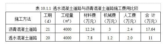 本工法因材料簡單,節(jié)約了大量的材料租賃費(fèi)、人工費(fèi)、機(jī)械費(fèi)用,提高了施工質(zhì)量和施工進(jìn)度。以紅島片區(qū)大洋一路道路及綜合配套工程自行車道為例,透水混凝土道路與瀝青混凝土道路施工費(fèi)用對比見表10.1.1,可見透水混凝土道路施工成本較低,施工費(fèi)用總工節(jié)約了6.64萬元。