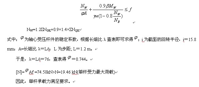根據(jù)《建筑施工扣件式腳手架安全技術(shù)規(guī)范》有關(guān)模板支架立桿的穩(wěn)定性計算公式[2]: