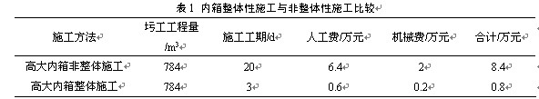 2) 內(nèi)箱整體性施工,由于可以提前制作整體模板,故可節(jié)約大量的時間和資金,具有較好的經(jīng)濟(jì)效益(見表1)。