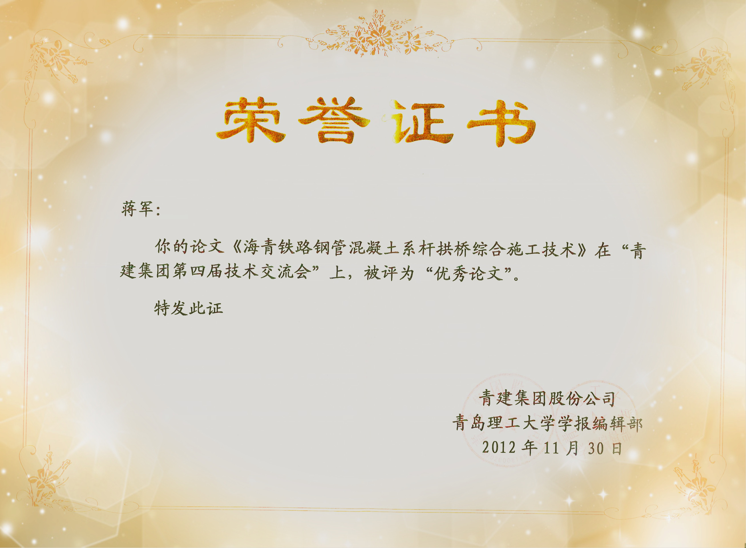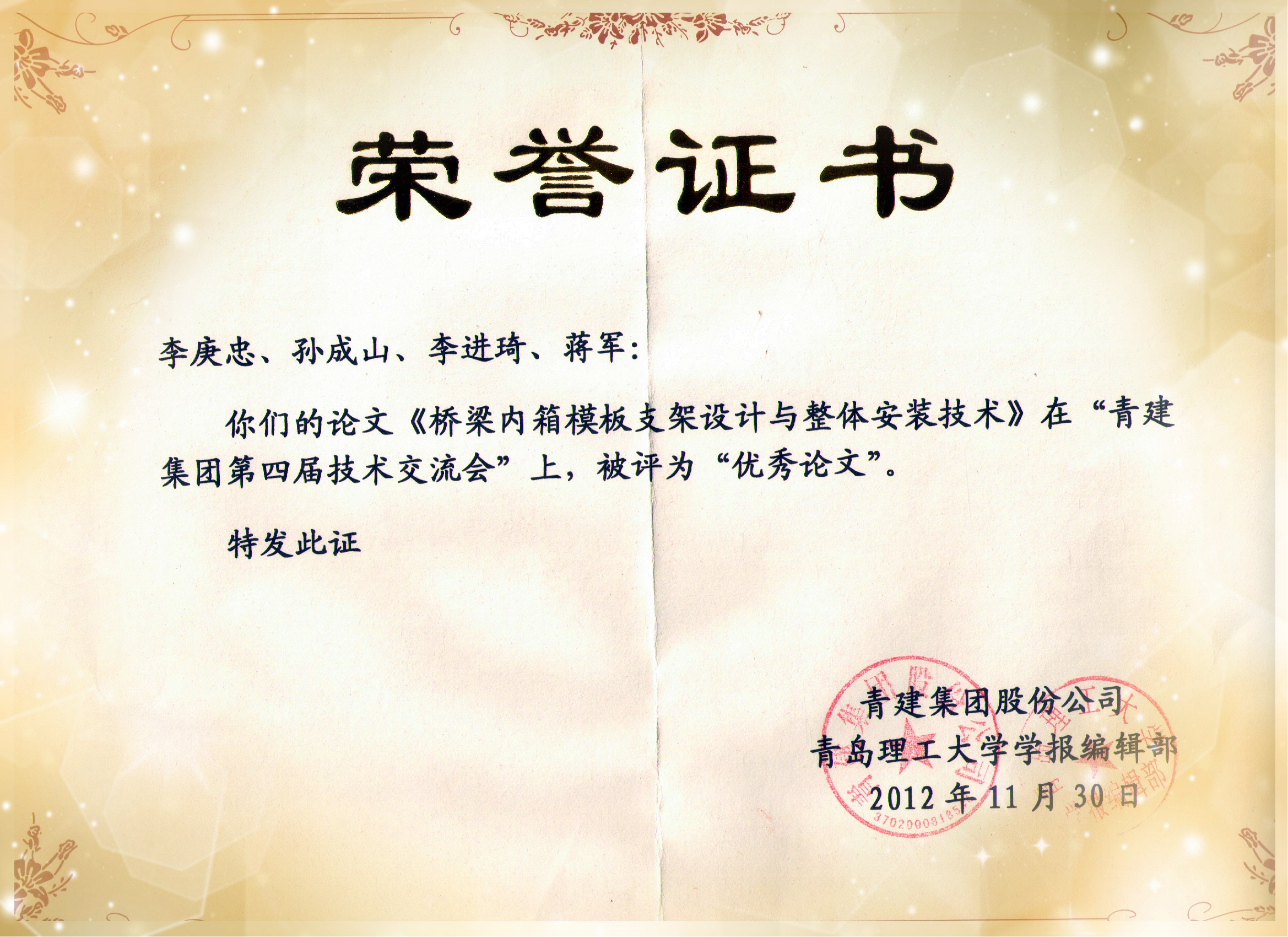 本次交流會議是繼青建集團首屆(2006)、第二屆(2008)、第三屆(2010)技術交流會成功舉辦之后的又一次技術盛會,以“交流、創(chuàng)新、合作、共贏”為宗旨,在校企雙方共同交流的基礎上,聘請國內知名專家進行專題講座,為廣大科技人員奉獻了一場知識盛宴。本次參會的論文主要是結合近年來集團各公司及成員單位項目施工過程中的重點、難點技術總結完成。共收集論文77篇,評選出優(yōu)秀論文26篇。我公司共提交論文7篇,其中《海青鐵路鋼管混凝土系桿拱橋綜合施工技術》(作者:蔣軍)、《橋梁內箱模板支架設計與整體安裝技術》(作者:李庚忠)獲得優(yōu)秀論文,蔣軍代表公司在會上作了交流匯報,優(yōu)秀論文作者獲得了集團股份公司與青島理工大學??庉嫴柯摵项C發(fā)的榮譽證書,含優(yōu)秀論文在內的5篇論文將在《青島理工大學學報》上公開發(fā)表。