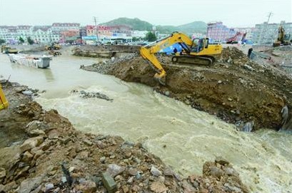 面對嚴峻的防汛救災(zāi)形勢,公司總經(jīng)理鞏光磊、副總經(jīng)理、道橋工程部經(jīng)理呂同占第一時間趕赴現(xiàn)場,冒雨指揮防汛救災(zāi)。按照嶗山區(qū)防汛指揮部的指示,需將2#橋挖斷泄洪,但由于現(xiàn)場土方量過大,影響排水,為此,在公司領(lǐng)導的指揮下,項目部管理人員種偉騰、孫曉波冒雨引導車輛,趕在暴雨之前外運土方1500余方;項目經(jīng)理劉凱指揮人員轉(zhuǎn)移用電設(shè)備,布置緊急用點線路;王紀安指揮工人倒運倒運施工現(xiàn)場材料,加固圍擋及板房。此時已值27日凌晨4點,雨水已經(jīng)開始進入河邊的住宅小區(qū),管理人員全部到達現(xiàn)場指揮防汛。由于此次降雨與天文大潮同至,海潮遲遲不退,若此時挖橋,非但無法泄洪,還有可能引起海水倒灌。就這樣,公司領(lǐng)導及項目部全體人員在風雨中等了2個多小時,期間調(diào)來了長臂挖掘機1臺,吊車2臺,360挖掘機2臺。早上6點多,海潮終于退去,管理人員各就各位,指揮人員、設(shè)備挖開2#橋,并安排外調(diào)砼管160余米,對開挖的調(diào)流路進行下管。經(jīng)過三個多小時的排水,漫水現(xiàn)象基本解除,截至27日中午,沙子口橋河水降到安全水位,14時,調(diào)流輔橋開始回填修復,經(jīng)過近5個小時的回填、夯實,晚上7時許,第一輛公交車通過恢復后的調(diào)流路,至此,交通全部恢復。