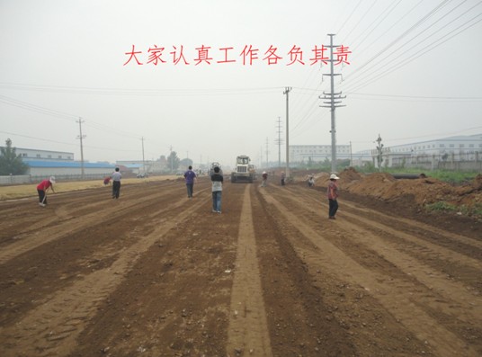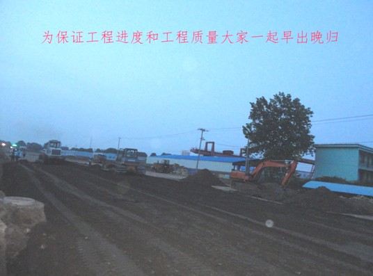 自6.21日起,柳州路(揚州路~蘭州路)開始進行水泥穩(wěn)定砂礫土底基層攤鋪工作。項目部結合現(xiàn)場狀況及車輛運輸?shù)缆?,首先從寺門首路路口開始向揚州路方向施工,鋪裝到揚州路路口之后,再從寺門首路路口向蘭州路方向施工。鏖戰(zhàn)一朝拉開,時間就是效益。在整個施工過程中,項目部全體員工,頂著烈日酷暑,奮戰(zhàn)在施工第一線。每天早上五、六點到工地,中午輪流用餐,一直工作到晚上九、十點鐘,每天工作時間都超過12小時。經過十天的努力工作,在6月30日暴雨來臨前完成了全線水泥穩(wěn)定砂礫土底基層的鋪裝,共約58000m2,確保了工程后續(xù)工序在汛期的正常施工進度。