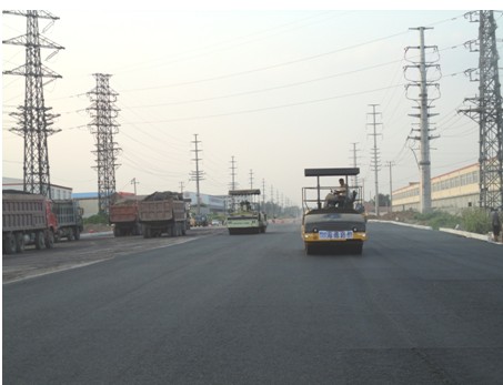 膠州西部城區(qū)柳州路(揚州路~蘭州路)道路工程在完成現(xiàn)場路緣石安裝、瀝青混合料訂貨、施工機械進場等各項準(zhǔn)備工作后,于2013年8月31日開始了瀝青混凝土路面的攤鋪工作,并于9月8日完成揚州路—蘭州路段瀝青混凝土攤鋪,鋪裝總面積約62500m2。