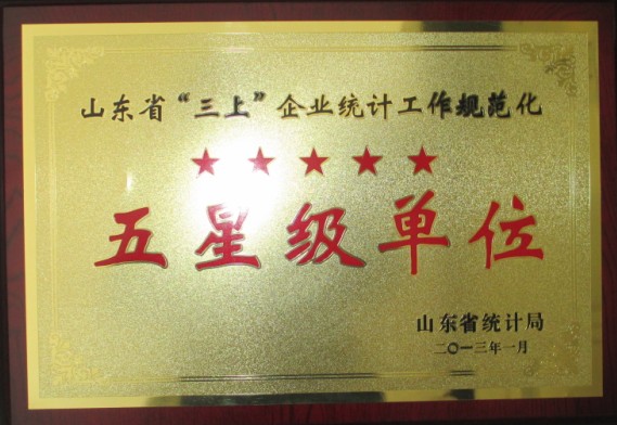 2013年,山東省統(tǒng)計局為推進“四大工程”建設(shè),加強企業(yè)統(tǒng)計基礎(chǔ)工作,確保源頭數(shù)據(jù)真實準(zhǔn)確、完整,開展了“山東省‘三上’企業(yè)統(tǒng)計工作星級單位”的評定工作,經(jīng)評選,我單位被省統(tǒng)計局授予“山東省三上企業(yè)統(tǒng)計工作規(guī)范化—五星級單位”的光榮稱號。