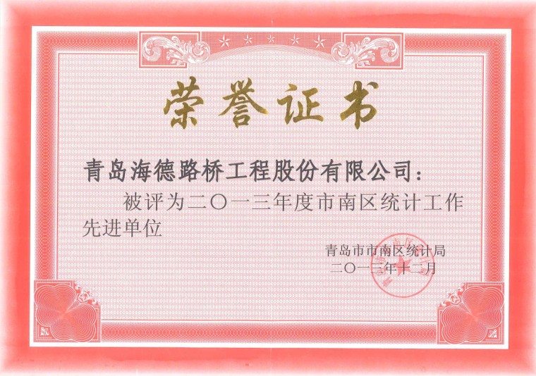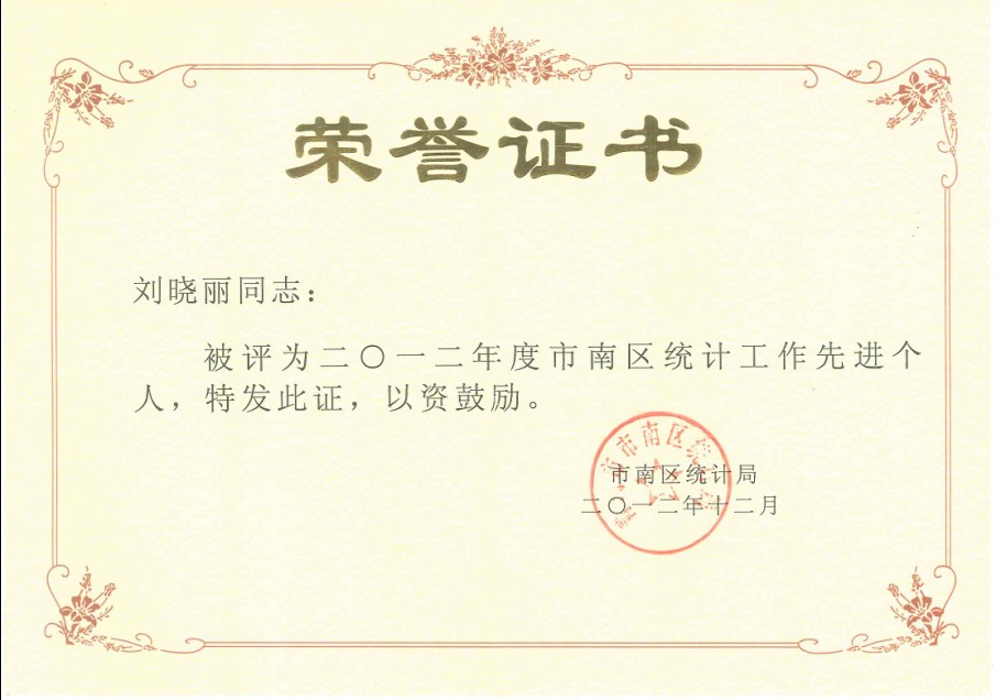 經(jīng)過山東省、青島市、市南區(qū)統(tǒng)計單位的層層審核,我單位最終被授予“省級五星級單位”的稱號。另外,由于上報統(tǒng)計報表數(shù)據(jù)及時準(zhǔn)確,我單位2013年再次被市南區(qū)統(tǒng)計局授予“市南區(qū)統(tǒng)計工作先進單位”的稱號,合約部劉曉麗也在2012年12月榮獲“市南區(qū)統(tǒng)計工作先進個人”的榮譽稱號,并頒發(fā)榮譽證書予以通報表揚。