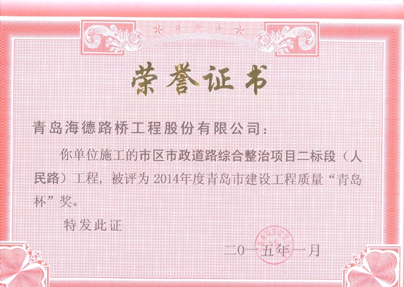 2015年第一季度由青島市城鄉(xiāng)建設(shè)委員會、青島市建筑業(yè)協(xié)會組織,經(jīng)青島市建設(shè)工程質(zhì)量“青島杯”獎評審委員會審定,我公司市區(qū)市政道路綜合整治項目二標段(人民路)榮獲2014年度青島市建設(shè)工程質(zhì)量“青島杯”獎。