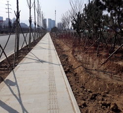 該工程于2015年8月份正式開工,11月底施工范圍垃圾外運全部完成,春節(jié)前管道工程施工完成,并進(jìn)行種植土回填。春季是苗木栽植的黃金時節(jié),為提高綠化苗木成活率,項目部提出“抓早字、促進(jìn)度”的施工方針,正月初五人員全部到位,正月初七復(fù)工。深翻地、挖樹穴,調(diào)苗木,同江路項目部人員積極協(xié)調(diào)組織,克服冬期施工、交叉作業(yè)等重重困難,全力推進(jìn)施工進(jìn)度。截止目前,喬木種植已基本完成,灌木種植完成70%,地被也在緊張有序的展開施工,景觀效果已初步體現(xiàn)。