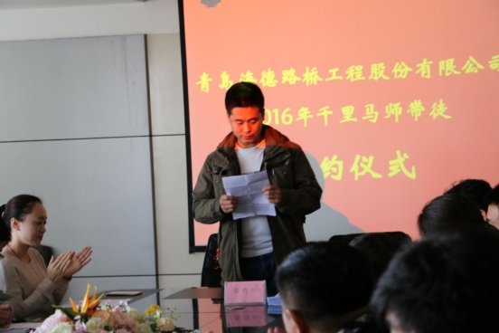 11月15日,我公司成功舉行“千里馬師帶徒”2015屆匯報總結及2016屆拜師簽約儀式,本次儀式共有6對師徒進行幫帶總結,并有14對新師徒簽約結成對子。公司工會主席、副總裁呂同占,總裁助理、財務部經理石婧,一分公司總經理劉凱,綜合管理部經理孟鵬等多位公司領導及有關員工共50余人參加了本次活動。