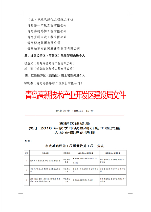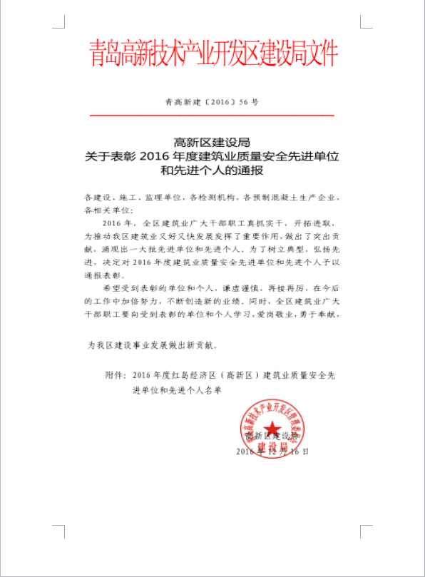 2016年12月底,高新區(qū)建設(shè)局召開了“2016年度建筑業(yè)質(zhì)量安全先進(jìn)單位和先進(jìn)個人表彰大會”,我公司憑借在高新區(qū)市政基礎(chǔ)設(shè)施建設(shè)工作中取得的優(yōu)異成績,被評為“2016年度紅島經(jīng)濟(jì)區(qū)(高新區(qū))建筑業(yè)質(zhì)量安全先進(jìn)單位”,公司承建的規(guī)劃中48號線道路、綜合配套及綠化工程被評為市政基礎(chǔ)設(shè)施工程質(zhì)量較好工程,公司程顯光和劉凱被評為紅島經(jīng)濟(jì)區(qū)(高新區(qū))質(zhì)量管理先進(jìn)個人、鄒曉杰被評為紅島經(jīng)濟(jì)區(qū)(高新區(qū))安全管理先進(jìn)個人。