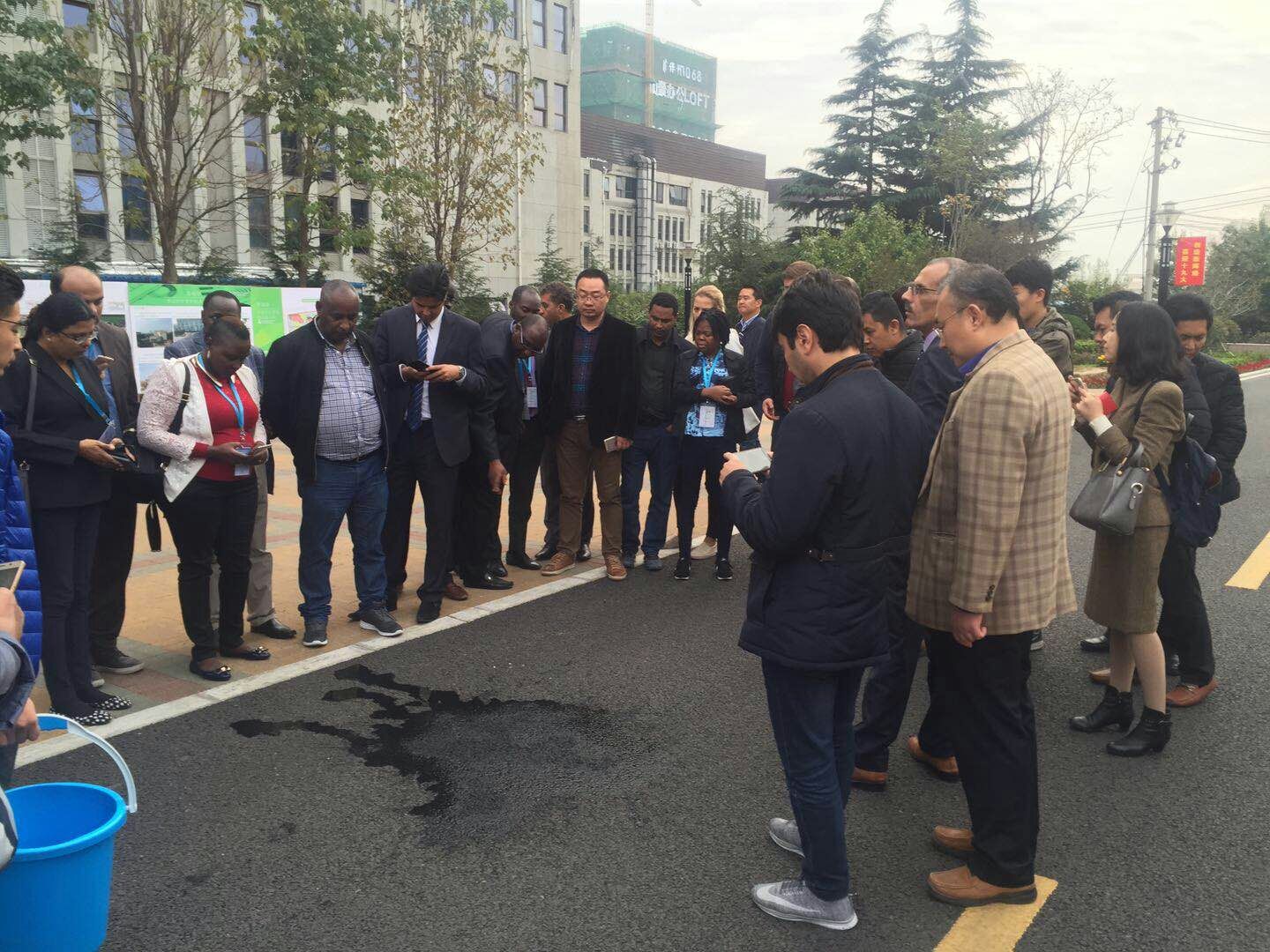 參觀國(guó)信體育場(chǎng)及李滄區(qū)委黨校海綿城市樣板工程現(xiàn)場(chǎng)圖片,圖為一分同事為官員們介紹工程并解答相關(guān)的技術(shù)問題。