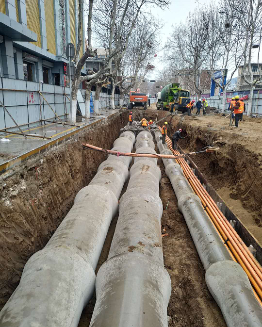 目前氣象局連接路強弱電管線全部鋪設完成,累計拆除人行道1400㎡,開挖土方1500m3;九丈崖路完成污水管道380m,土路基已基本碾壓成型;樂園大街砼路面破碎完成外運13000㎡,通海路至長山路段電力包封施工完成,通海路至陵園路綜合管槽開挖220m、雨污水管及弱電管線敷設500米、弱電、強電管敷設完成,檢查井砌筑完成。