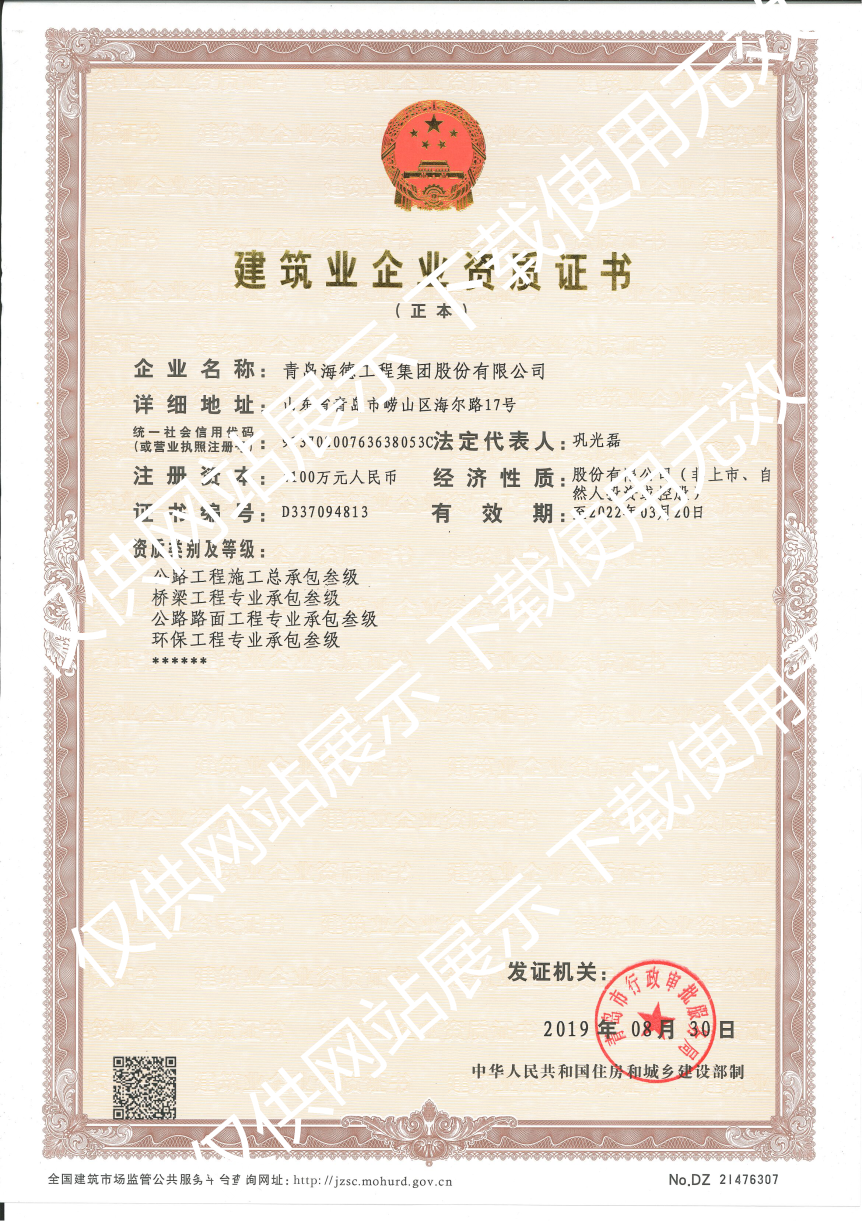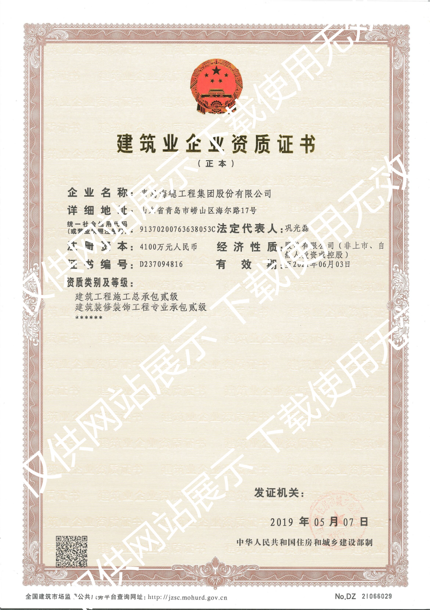 日前,集團新申請的建筑裝修裝飾工程專業(yè)承包二級資質(zhì)、橋梁工程專業(yè)承包三級資質(zhì)陸續(xù)通過主管部門審查,并取得資質(zhì)證書。