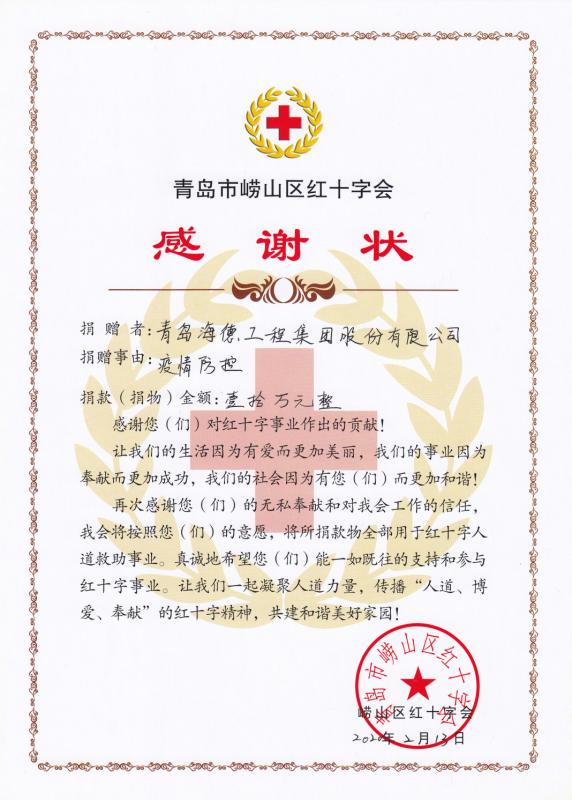 截至目前,集團公司累計捐款157022元。其中海德集團向青島嶗山區(qū)紅十字會捐款10萬元,集團公司員工向嶗山區(qū)紅十字會捐款37916元、其他途徑捐款9106元,青島匯泉勞務工程有限公司向嶗山區(qū)慈善總會捐款10000元。集團公司建安分公司膠州李哥莊雨污水工程項目部為李哥莊鎮(zhèn)日夜值班的一線疫情防控人員捐助價值12000元的不銹鋼飯盒。