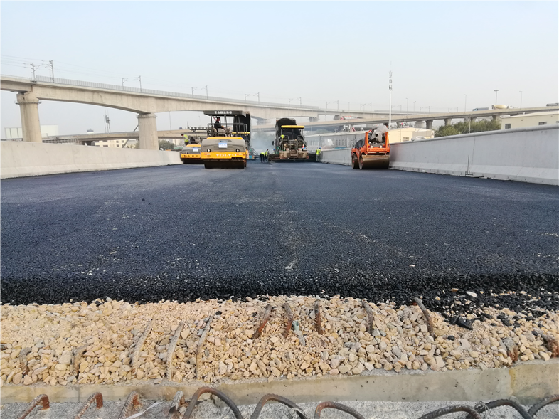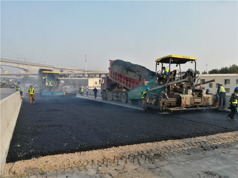 此次瀝青攤鋪施工范圍為主線路基段ZX200-300段底層瀝青攤鋪及主線橋ZX40-44段下面層瀝青施工,施工面積共計(jì)5200㎡。采用分幅全斷面攤鋪,施工作業(yè)人員準(zhǔn)確跟蹤瀝青運(yùn)輸車行駛軌跡和卸料時(shí)間等,確保瀝青料溫度在可控范圍之內(nèi),施工現(xiàn)場(chǎng)嚴(yán)格遵循“緊跟、慢壓、高頻、低幅”的工藝要求,把關(guān)瀝青混凝土的拌和、攤鋪、碾壓等各個(gè)環(huán)節(jié)。至當(dāng)日19時(shí),首段主線瀝青攤鋪順利完成,為項(xiàng)目接下來開展大面積瀝青施工奠定了基礎(chǔ),拉開了主線瀝青面層施工大干的序幕。