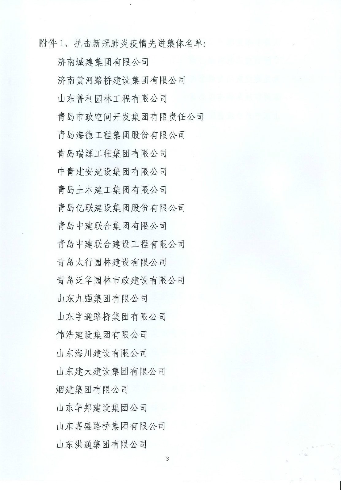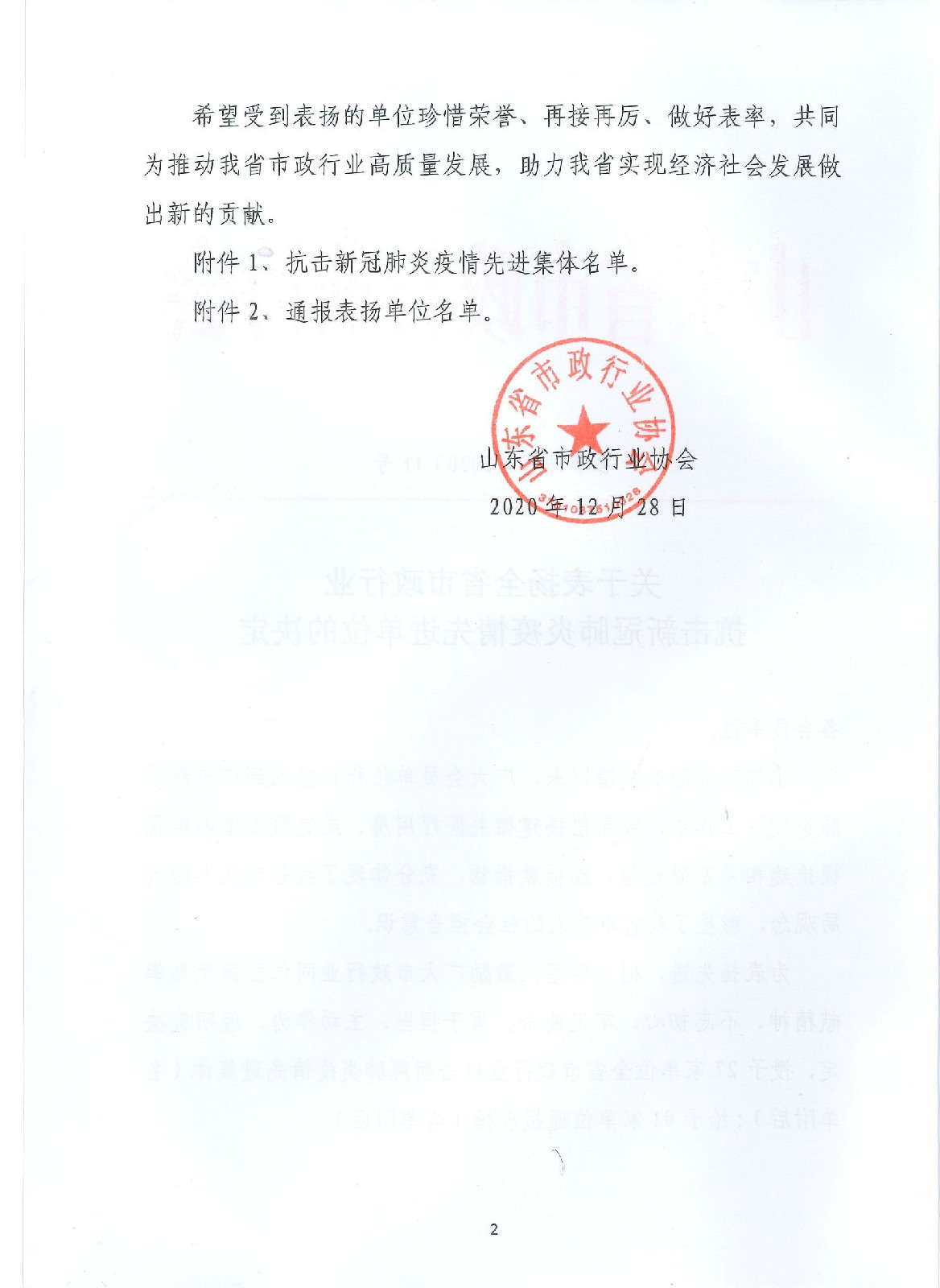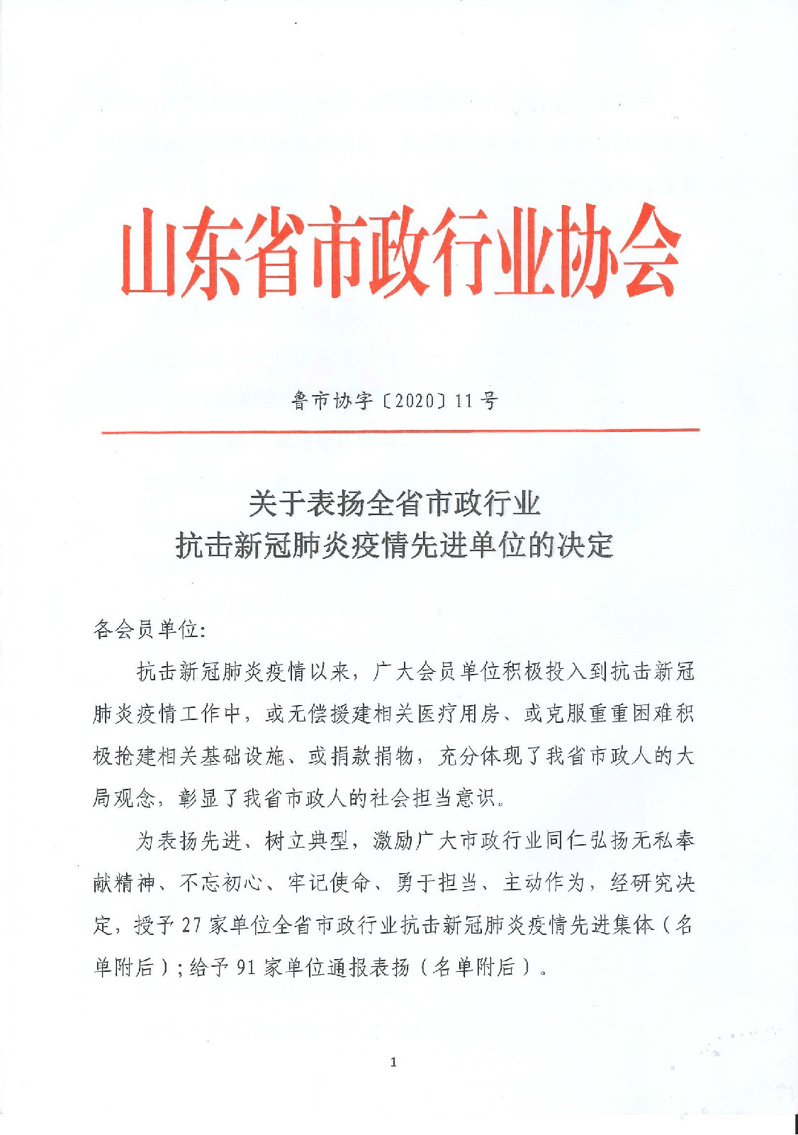 2020年12月28日,山東省市政行業(yè)協(xié)會(huì)印發(fā)《關(guān)于表揚(yáng)全省市政行業(yè)抗擊新冠肺炎疫情先進(jìn)單位的決定》,集團(tuán)公司榮獲全省市政行業(yè)抗擊新冠肺炎疫情先進(jìn)集體稱號(hào)。
