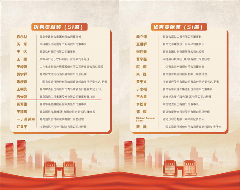 5月16日,嶗山區(qū)高規(guī)格召開區(qū)委人才工作會議暨優(yōu)秀企業(yè)家表彰大會,對于GDP破千億起點(diǎn)再出發(fā)的嶗山而言,有著不同尋常的意義。嶗山區(qū)注冊資本億元以上企業(yè)983家,占全市10.59%;5億元以上企業(yè)244家,占全市15.35%;10億元以上企業(yè)137家,占全市17.84%?,F(xiàn)場揭曉了獲得嶗山區(qū)發(fā)展功勛獎(jiǎng)、杰出成就獎(jiǎng)、優(yōu)秀貢獻(xiàn)獎(jiǎng)、新銳貢獻(xiàn)獎(jiǎng)等73名企業(yè)家,青島市政協(xié)副主席、嶗山區(qū)委書記張?jiān)?,嶗山區(qū)區(qū)長楊克敏出席會議并為獲獎(jiǎng)?wù)哳C獎(jiǎng)。我集團(tuán)董事長鞏光磊連續(xù)三年榮獲“優(yōu)秀貢獻(xiàn)獎(jiǎng)”。