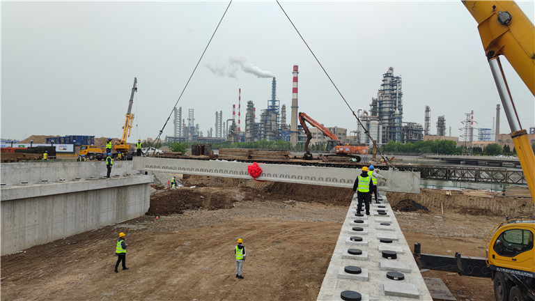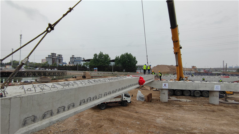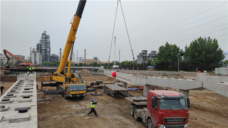 2022年5月13日上午,唐河路-安順路打通工程婁山后河橋施工現(xiàn)場,一臺大型吊車吊著預(yù)制空心板緩緩移動(dòng),吊裝機(jī)械和施工人員緊密配合,空心板被精確地吊放在指定位置,標(biāo)志著婁山后河橋正式進(jìn)入上部結(jié)構(gòu)施工階段,距完成節(jié)點(diǎn)目標(biāo)又邁進(jìn)了關(guān)鍵一步。