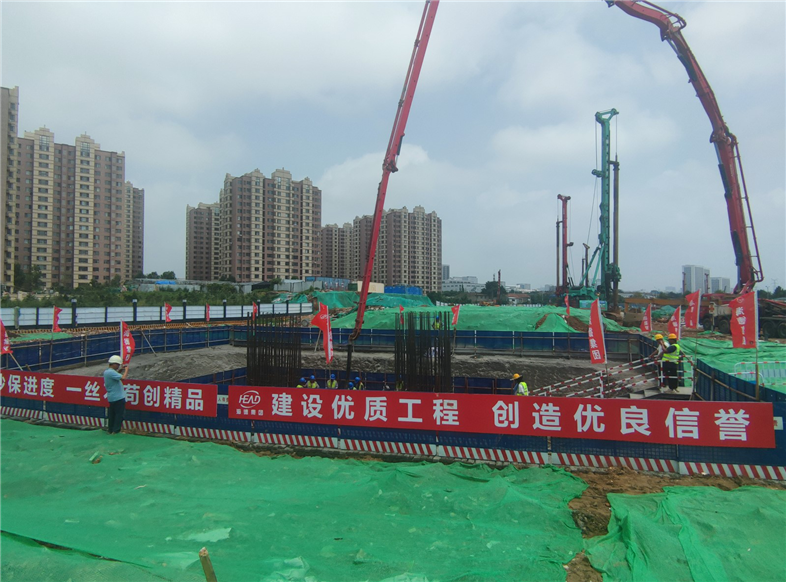 首座承臺澆筑為主線橋6#承臺,為確保承臺首件工程施工質(zhì)量,項(xiàng)目部嚴(yán)格遵循“質(zhì)量與安全并重、技術(shù)與施工并行”的原則,安全高效保質(zhì)保量地推進(jìn)承臺澆筑施工。工地上,延伸數(shù)百米遠(yuǎn)的作業(yè)面內(nèi),振動打樁機(jī)、旋挖鉆機(jī)、吊車等大型機(jī)械密集分布,同步流水作業(yè);建筑工人頭頂烈日,穿梭于機(jī)械轟鳴的施工現(xiàn)場,揮汗如雨。首個承臺澆筑過程中,根據(jù)領(lǐng)導(dǎo)班子帶班制度的規(guī)定,領(lǐng)導(dǎo)和技術(shù)人員全程旁站,為“首件工程”圓滿落地保駕護(hù)航。