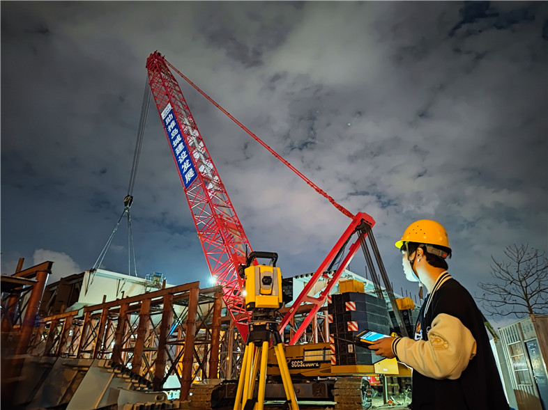 為了不影響白天道路的正常通行,深圳路節(jié)點(diǎn)橋鋼箱梁的吊裝工作進(jìn)行夜間搶工。在施工過程中最新引入了“北斗精確定位”鋼箱梁分塊數(shù)據(jù)檢測系統(tǒng),吊裝過程中,放置在一旁的智能儀器會緊緊地“盯住”吊裝梁體,快速處理來自北斗衛(wèi)星的信息,通過手持式智能顯示屏為地面人員提供“毫米級”精度定位數(shù)據(jù),助力項(xiàng)目安全高效建設(shè)。