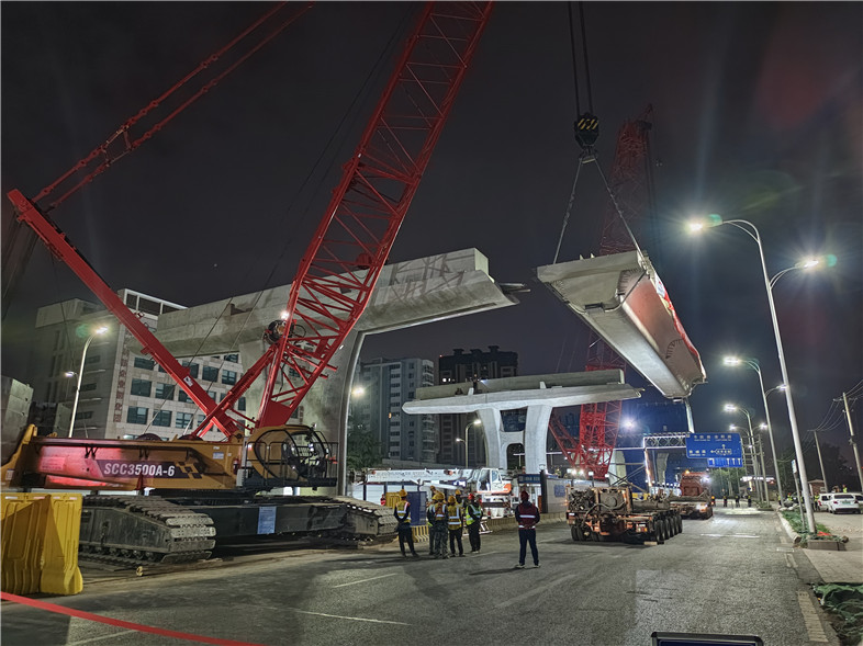 現(xiàn)場采用兩臺350噸履帶吊“雙機抬吊”方式架設(shè),于26日晚22:58啟動架設(shè),27日凌晨0:16完成首榀箱梁架設(shè),凌晨3:38完成整跨箱梁架設(shè)。為確保吊裝工作安全有序進行,參建各方高度重視,多次召開箱梁運輸?shù)跹b專題會,施工前制定了嚴密的施工方案及應(yīng)急預(yù)案,并通過專家論證。在集團各部門緊密配合下,箱梁架設(shè)現(xiàn)場人員分工明確、過程把控到位,確保了箱梁架設(shè)工作安全順利進行。