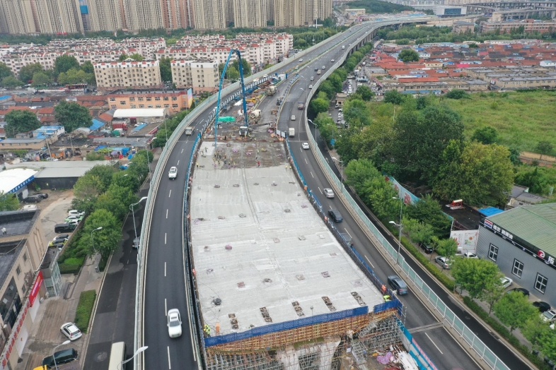 重慶路快速路工程南起山東路,北至仙山路,全長(zhǎng)17.7公里,項(xiàng)目建成后能夠有效緩解城區(qū)南北向路網(wǎng)交通擁堵,提高整體通行效率,支撐沿線產(chǎn)業(yè)園區(qū)加速發(fā)展。我集團(tuán)負(fù)責(zé)施工的四標(biāo)段現(xiàn)澆箱梁共兩聯(lián),長(zhǎng)度分別為90m、70m,南接現(xiàn)有高架,北接新建50m鋼混組合連續(xù)梁。本次澆筑的第一聯(lián)箱梁長(zhǎng)90m,寬25.6m,橋梁面積2304㎡,混凝土用量1945.7m3、強(qiáng)度C50,鋼筋用量336.34t,鋼絞線用量91.34t,現(xiàn)場(chǎng)使用兩臺(tái)汽車泵同時(shí)澆筑,澆筑時(shí)間持續(xù)30小時(shí)。