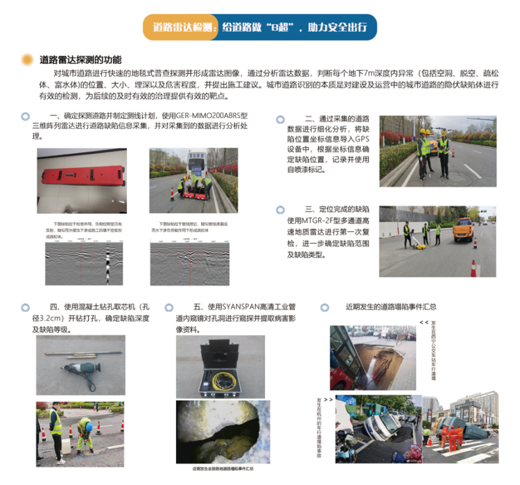 道路養(yǎng)護(hù)雷達(dá)探測(cè)是集團(tuán)針對(duì)目前國(guó)內(nèi)外因地下空間開(kāi)發(fā)規(guī)模擴(kuò)大導(dǎo)致塌陷事故頻發(fā)而設(shè)立的業(yè)務(wù)板塊。通過(guò)地質(zhì)雷達(dá)檢測(cè)車檢測(cè)系統(tǒng),實(shí)現(xiàn)對(duì)路面下病害體的快速掃描,結(jié)合現(xiàn)場(chǎng)實(shí)際結(jié)構(gòu)物情況,及時(shí)分析病害情況,對(duì)嚴(yán)重缺陷進(jìn)行驗(yàn)證,提出診治方案,為后續(xù)及時(shí)有效的治理提供有效的靶點(diǎn)。