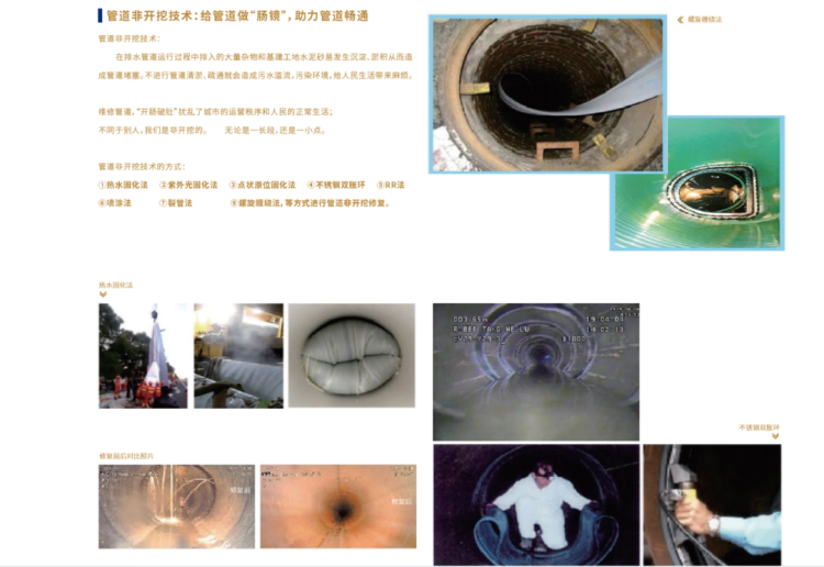 管道非開(kāi)挖修復(fù)技術(shù)指在不開(kāi)挖或少量開(kāi)挖作業(yè)坑的條件下,利用非開(kāi)挖技術(shù)對(duì)管道進(jìn)行修復(fù)、加固、以及更換。和傳統(tǒng)開(kāi)挖方式相比,管道非開(kāi)挖修復(fù)無(wú)需大面積開(kāi)挖、無(wú)需更換原管道,充分利用原管道,延長(zhǎng)管道使用壽命,可節(jié)省大量經(jīng)費(fèi)與施工時(shí)間。