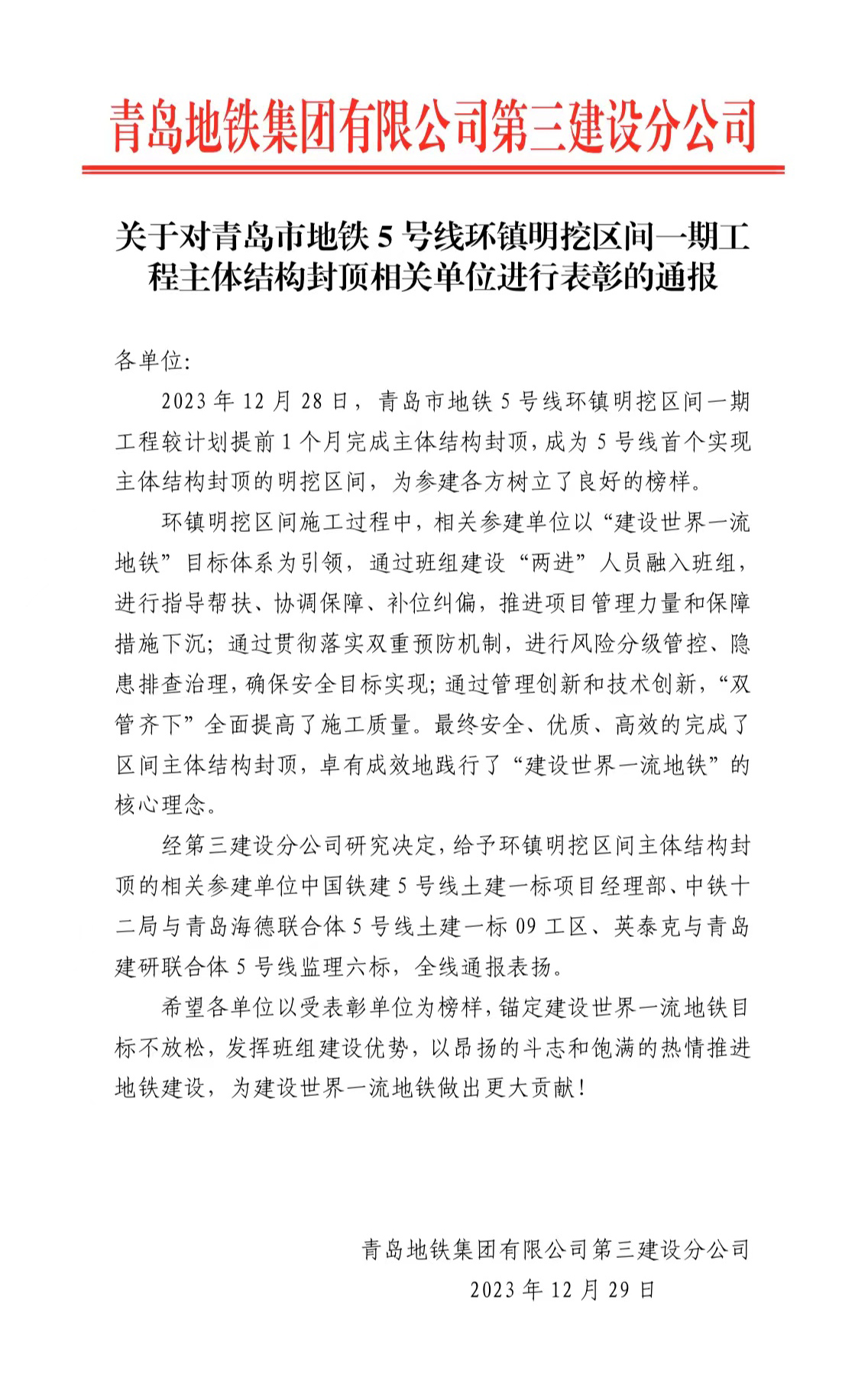 2023年12月28日,由集團(tuán)公司承建的地鐵5號(hào)線環(huán)鎮(zhèn)明挖區(qū)間項(xiàng)目主體結(jié)構(gòu)順利封頂,標(biāo)志著地鐵5號(hào)線唯一一座明挖區(qū)間完成重要里程碑節(jié)點(diǎn),地鐵集團(tuán)特此發(fā)來(lái)表彰,對(duì)集團(tuán)公司承建工作表示了肯定,為參建各方樹(shù)立了良好的榜樣。