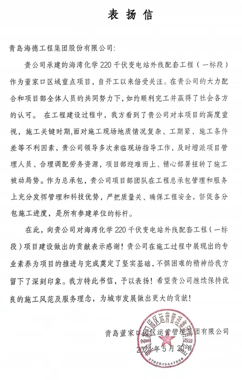 近日,集團(tuán)承建的海灣化學(xué)220kv變電站外線配套工程(一標(biāo)段)順利完工,為該區(qū)域基礎(chǔ)設(shè)施建設(shè)再添一座新的里程碑,建設(shè)單位特此發(fā)來表揚(yáng)信,對(duì)集團(tuán)和項(xiàng)目部的工作表示肯定和表揚(yáng)。